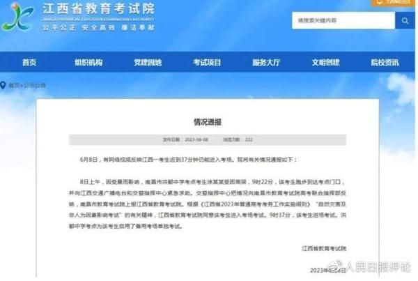 众所周知,为维护高考公平、防止考题泄露,考试须知明确规定,考试开始15分钟后,迟到考生不得进入考点参加当次科目考试。然而6月8日,有网友反映江西一考生迟到37分钟仍进入考场,引发网络热议。这