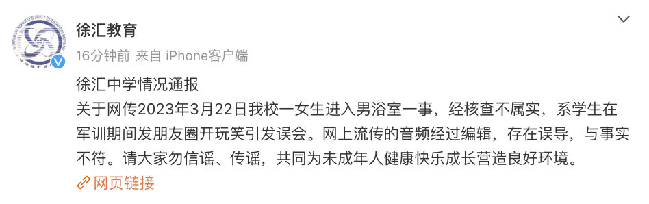 上海市徐汇区教育局官方微博@徐汇教育 3月27日发布徐汇中学情况通报:关于网传2024年3月22日我校一女生进入男浴室一事,经核查不属实,系学生在军训期间发朋友圈开玩笑引发误会。网上流传的音频经过编辑,存在误导,与事实不符。请大家勿信谣、传谣,共同为未成年人健康快乐成长营造良好环境。